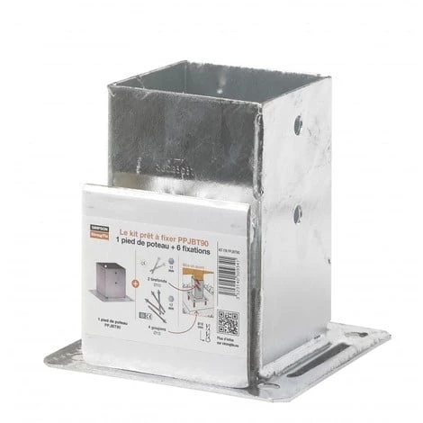 PPJBT90 est un pied de poteau carré de 91 sur platine. Sa fixation sur des plots en béton ou dans la pierre se fait très facilement grâce aux 4 goujons d’ancrage fournis dans ce kit. Les 2 tire-fonds vous permettront de fixer durablement vos poteaux dans le support.